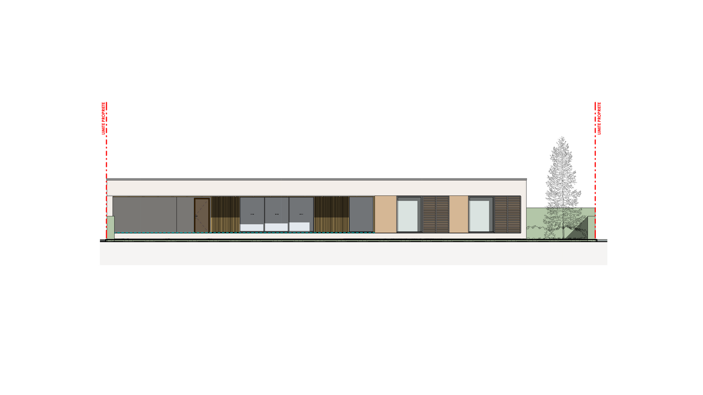 Ce projet de maison de plain-pied en ossature bois adopte une approche écologique, avec une isolation en paille, une toiture végétalisée et des pieux métalliques adaptés aux sols argileux. Son volume rectangulaire abrite un grand séjour ouvert sur une cuisine fonctionnelle. Les volets coulissants en bois ajouré filtrent la lumière et rythment les façades. Une large terrasse prolonge l’intérieur vers l’extérieur, renforçant le lien avec l’environnement.