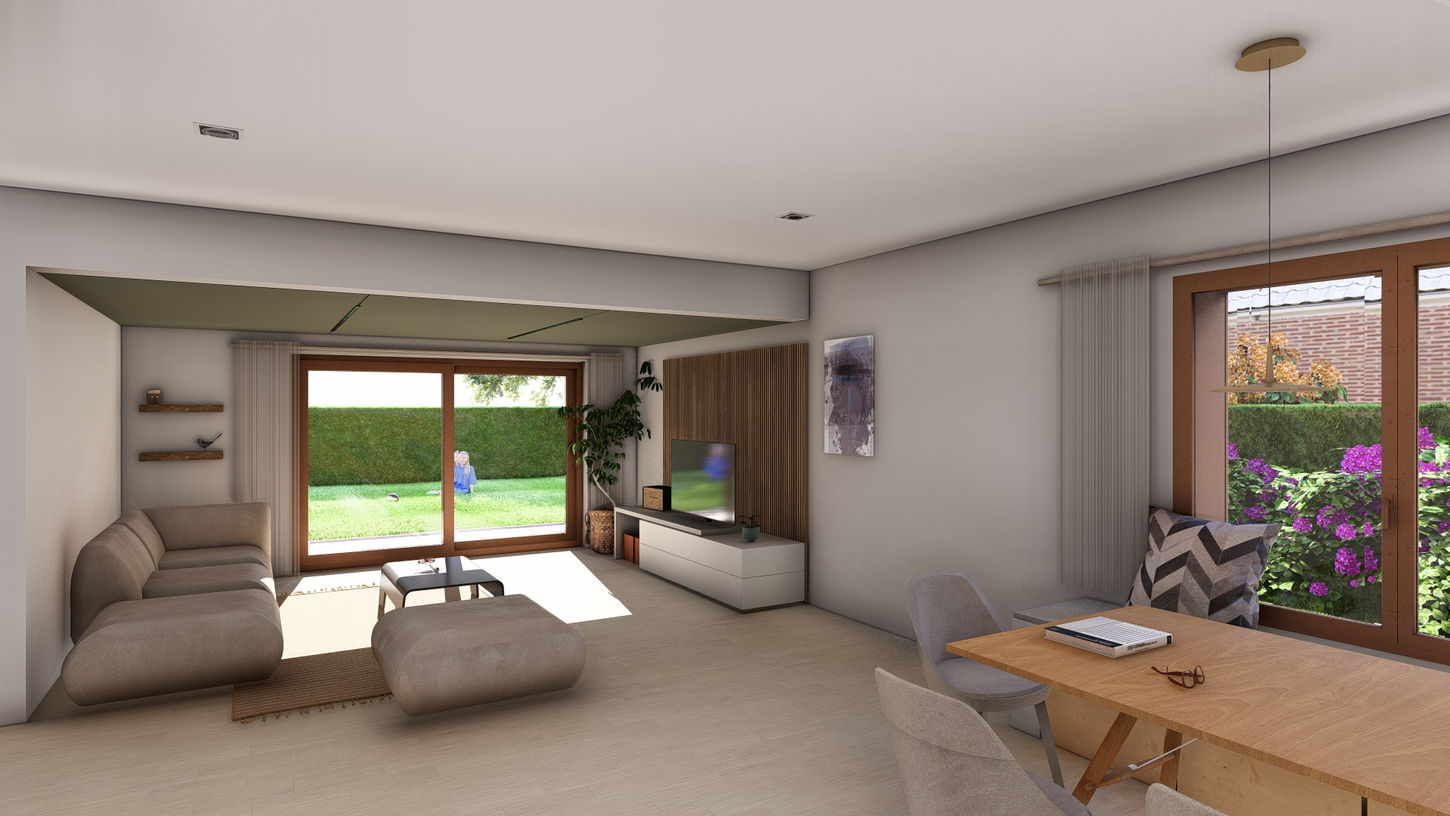 Le projet consiste en l’agrandissement d’un pavillon existant par une extension en ossature bois, habillée d’un bardage composite. Cette extension permet d’agrandir le séjour, de restructurer l’espace repas et de créer une terrasse couverte directement accessible depuis les pièces de vie.